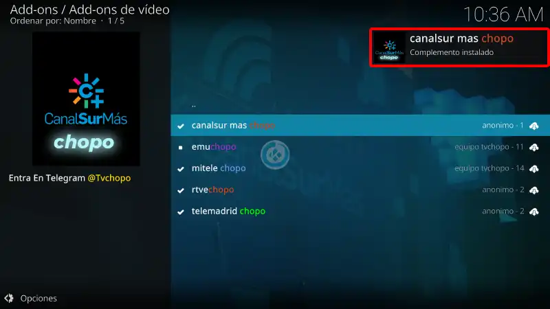 22. ¡Listo! El addon Canalsur Mas en Kodi habrá quedado instalado correctamente.